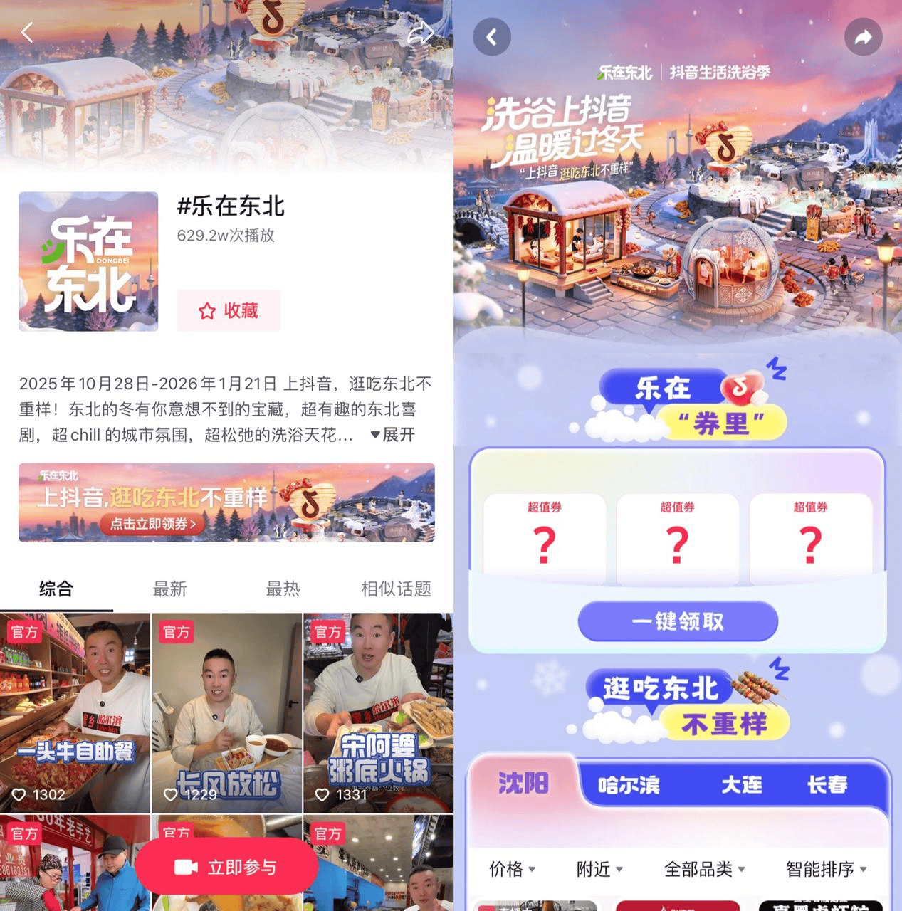 冬天的精彩不止北方。抖音生活服务中部大区结合“雪境山河图”“冰雪游园会”“热雪嘉年华”三大特色场景,号召商家以“冰雪+”进行创意场景营销,参与“冰雪封神榜”商家创意PK赛。活动将从交易与内容维度,评选“冰雪封神榜”各特色赛道TOP5商家,联合打造封神商家冰雪大事件,解锁冰雪明星空降、IP跨界营销、线下冰雪快闪等具体活动。南部大区联合云南、海南、四川、广东、广西、重庆、贵州、福建南方八省文旅部门,共同发起“来南方过冬——去往彩色的冬天”主题活动,集结温泉、滑雪、亲子乐园、自然景区等超2万个文旅商家,推出门票直降、住宿套餐折扣、专属券包等多重福利。